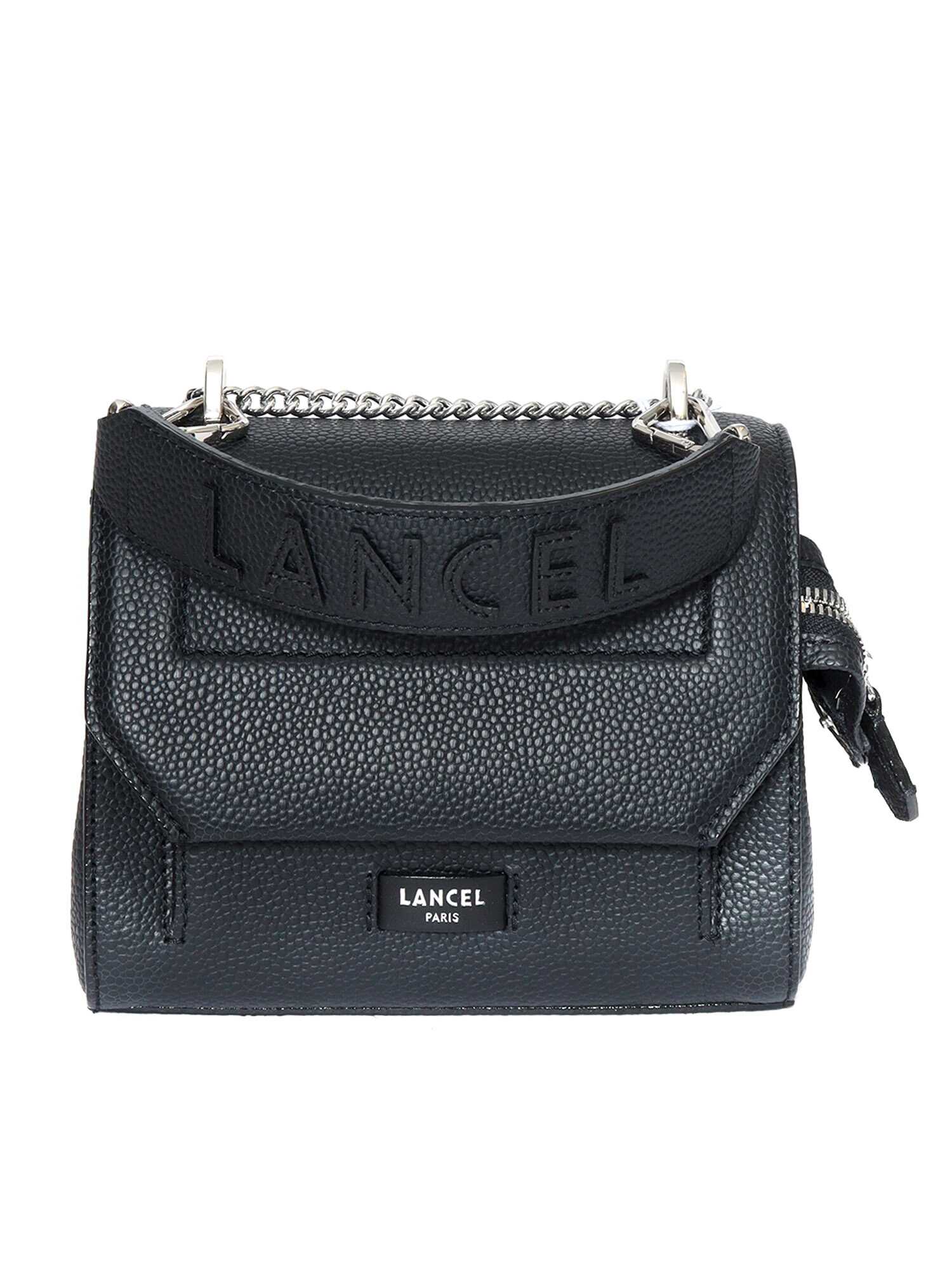 Textured leather bag, red grosgrain lining, external patch pocket on the back, external zip pocket on the front under flap, internal patch pocket, internal zip pocket, metal chain shoulder strap 17.5 x 15.5 x 9.5 cm
