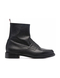 Thom Browne's AW22 collection includes this pair of almond-toe penny slot loafer boots. Crafted from black pebbled leather, they feature complimentary gold-tone hardware and a signature RWB logo pull tab at the ankle.