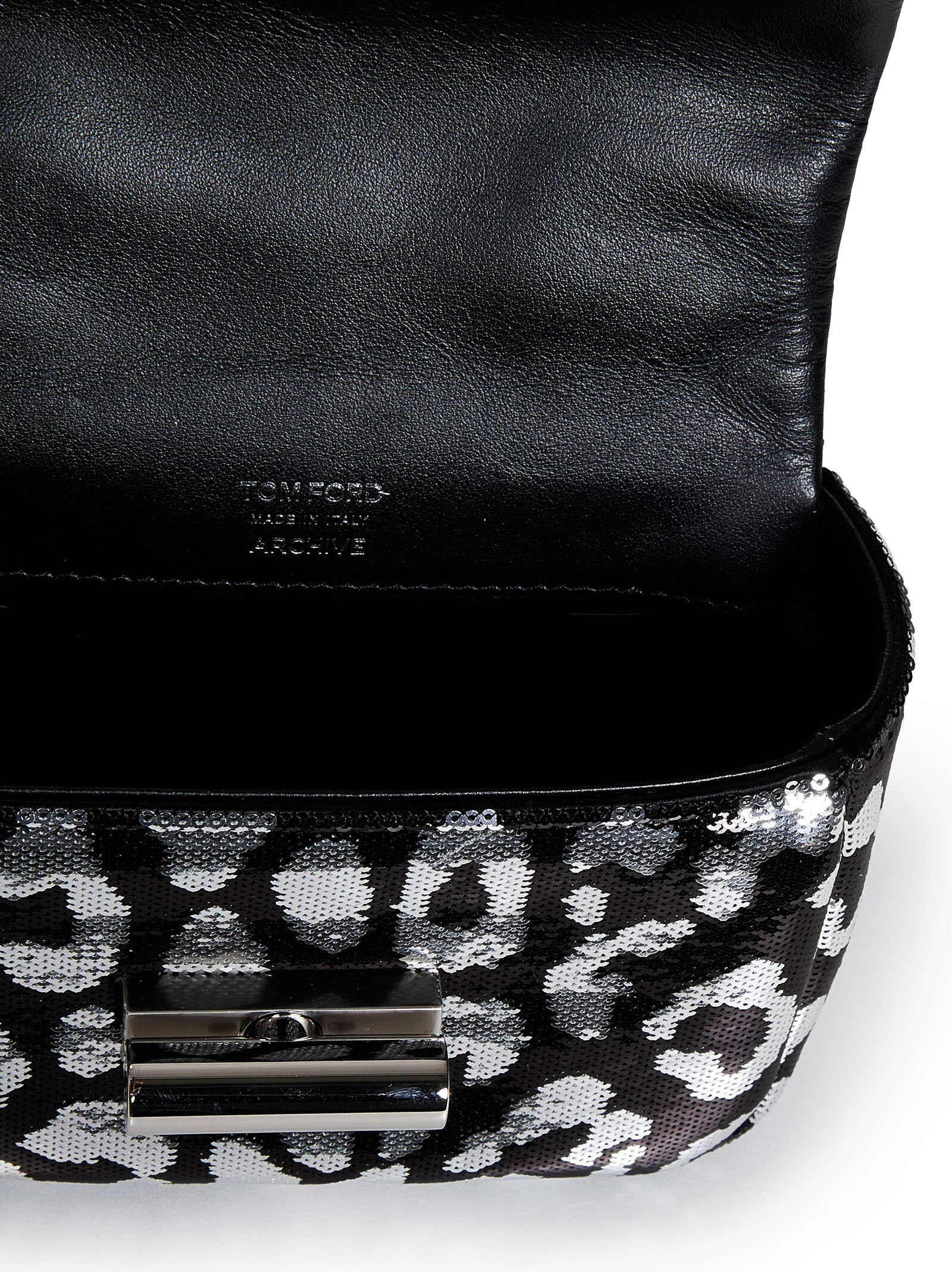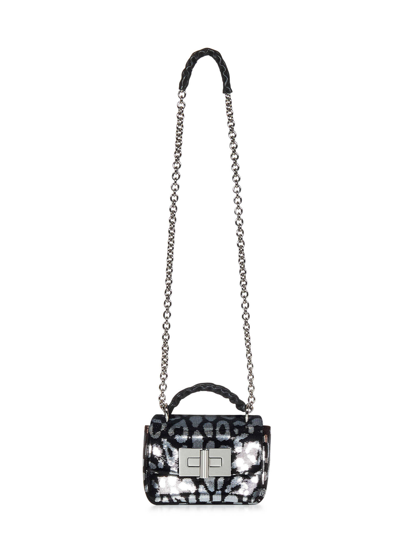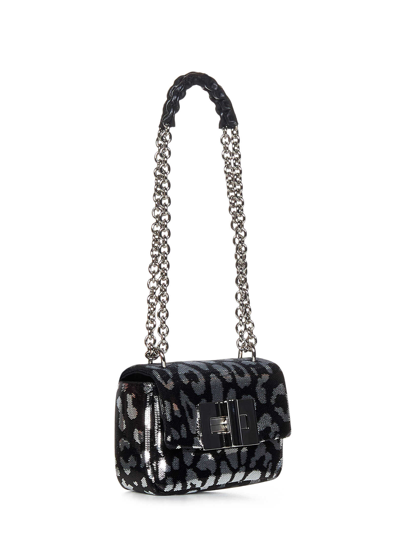 Black and silver animalier sequin embroidery shoulder bag with chain shoulder strap.