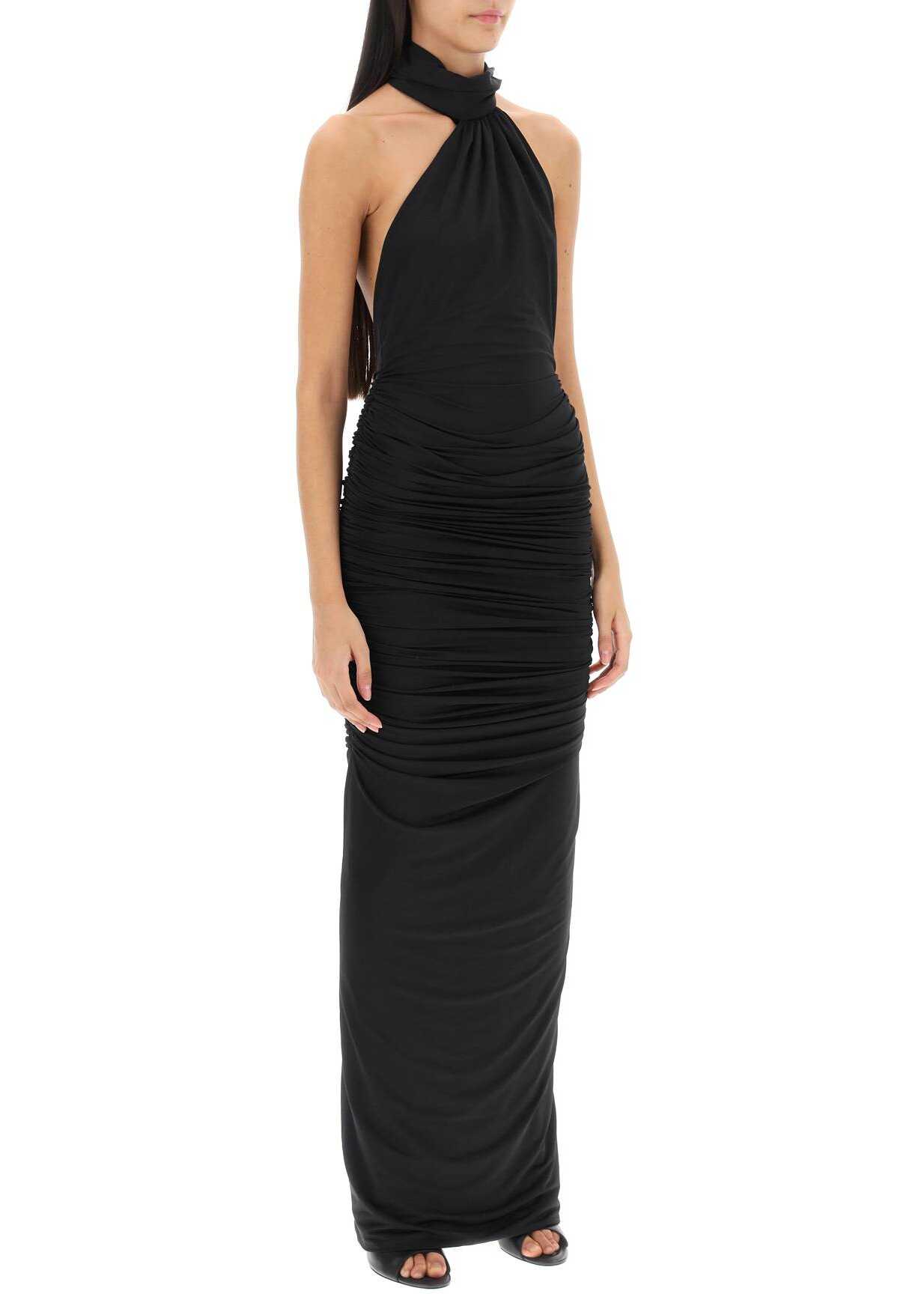 Giuseppe di Morabito maxi dress crafted in shiny-finish draped techno jersey. It features halterneck and closure with self-tie panels on the upper back and invisible zipper. Completed with a center-back vent. Body-hugging silhouette. The model is 177 cm tall and wears size IT 40.