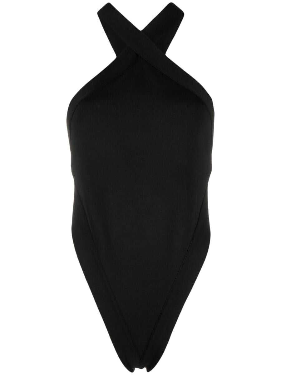 cut-out halterneck bodysuit from SAINT LAURENT featuring black, stretch-design, cut-out detailing, halterneck, sleeveless, open back and high cut. Just a reminder that this piece must be tried on over your own garments..