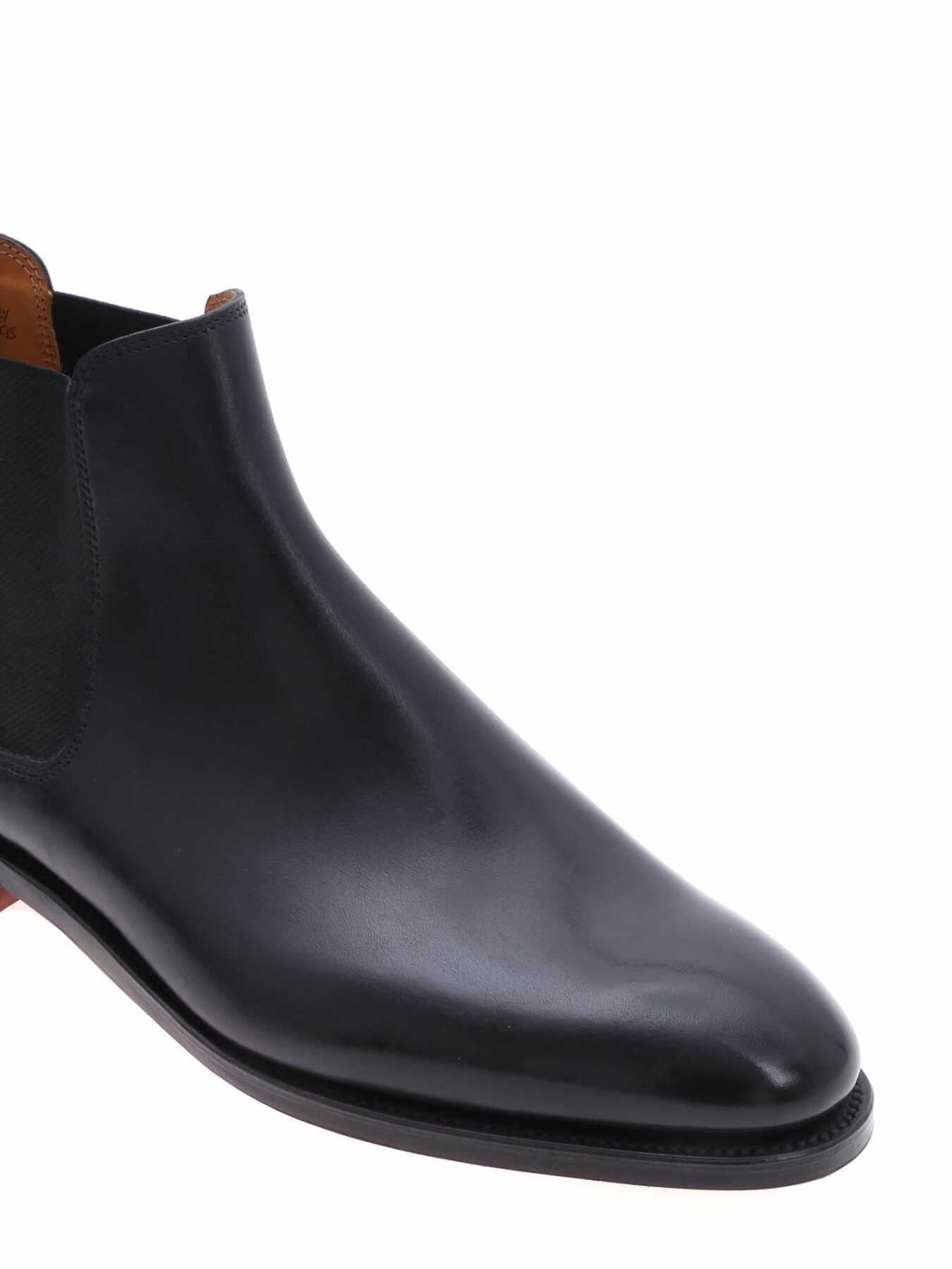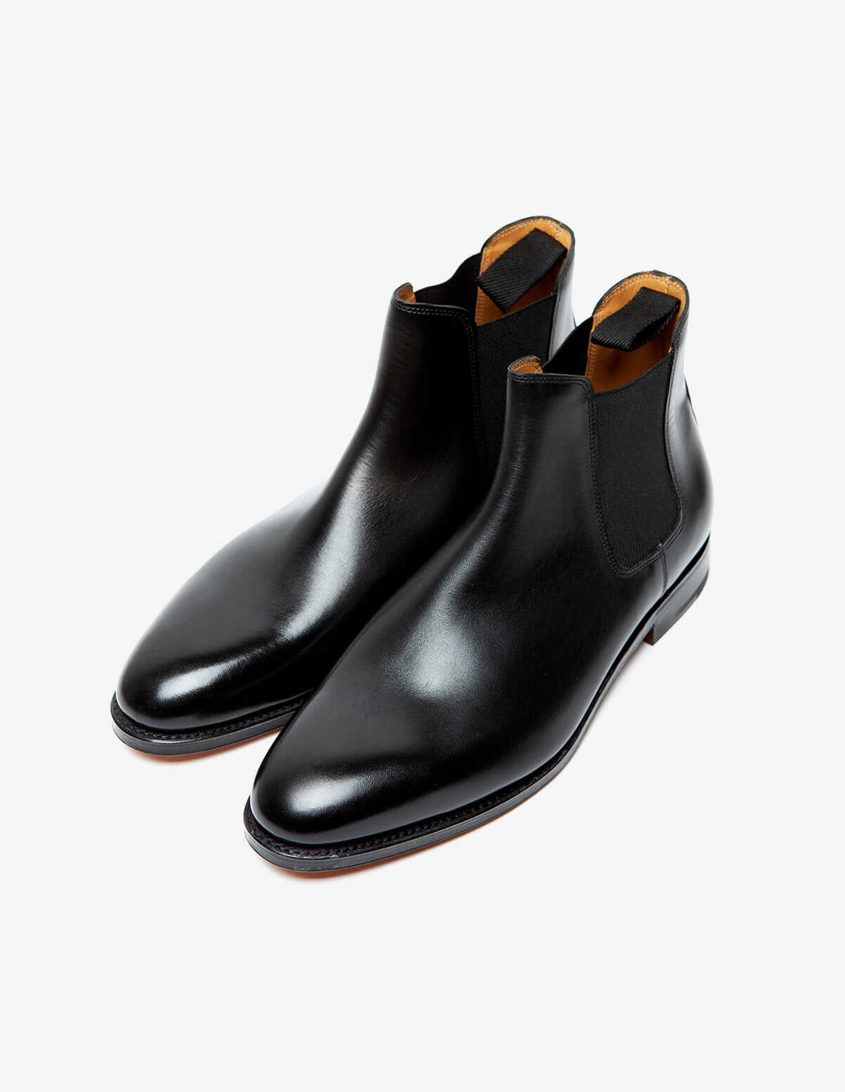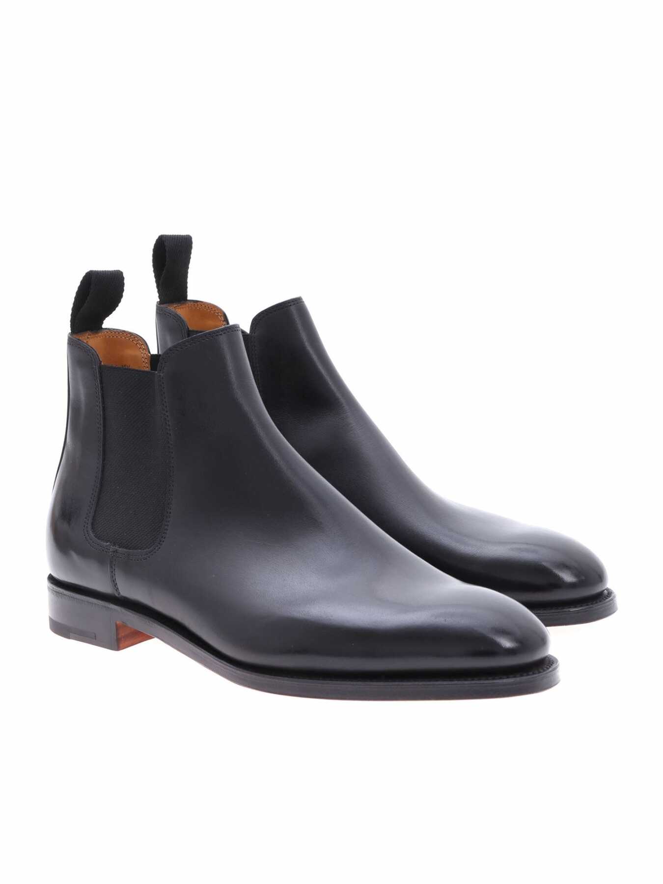 John Lobb Chelsea boot in black leather, entirely hand-stitched, fabric tie at the back, round toe, camel-colored leather interior, leather sole, fitting E.