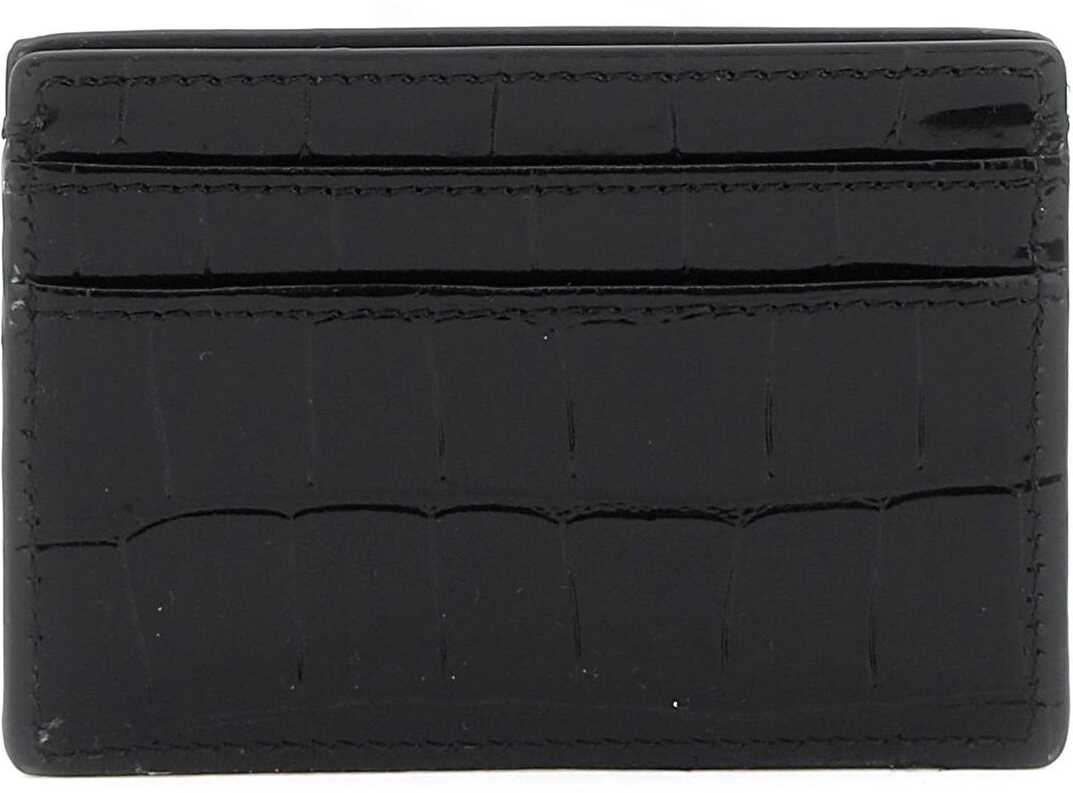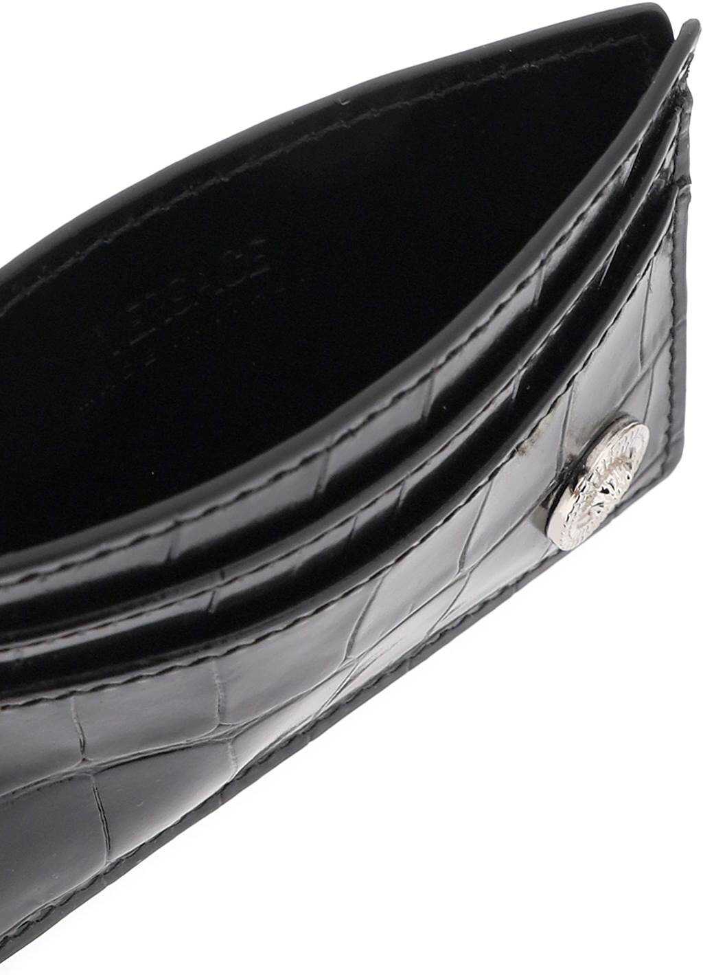 Versace cardholder made of croco-embossed leather and embellished with iconic silver-finished metal Medusa Biggie. It features four credit card slots and a central slit pocket.