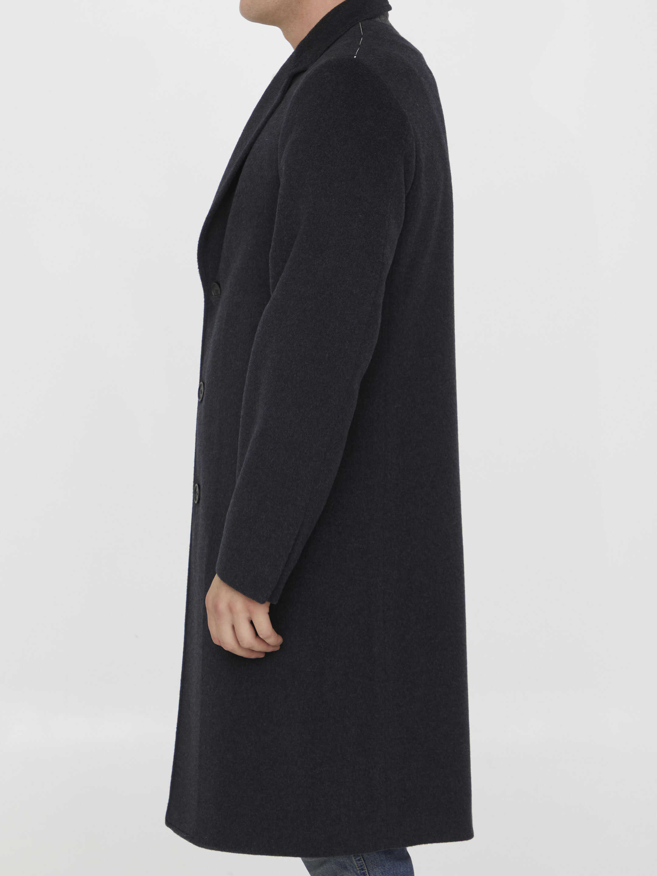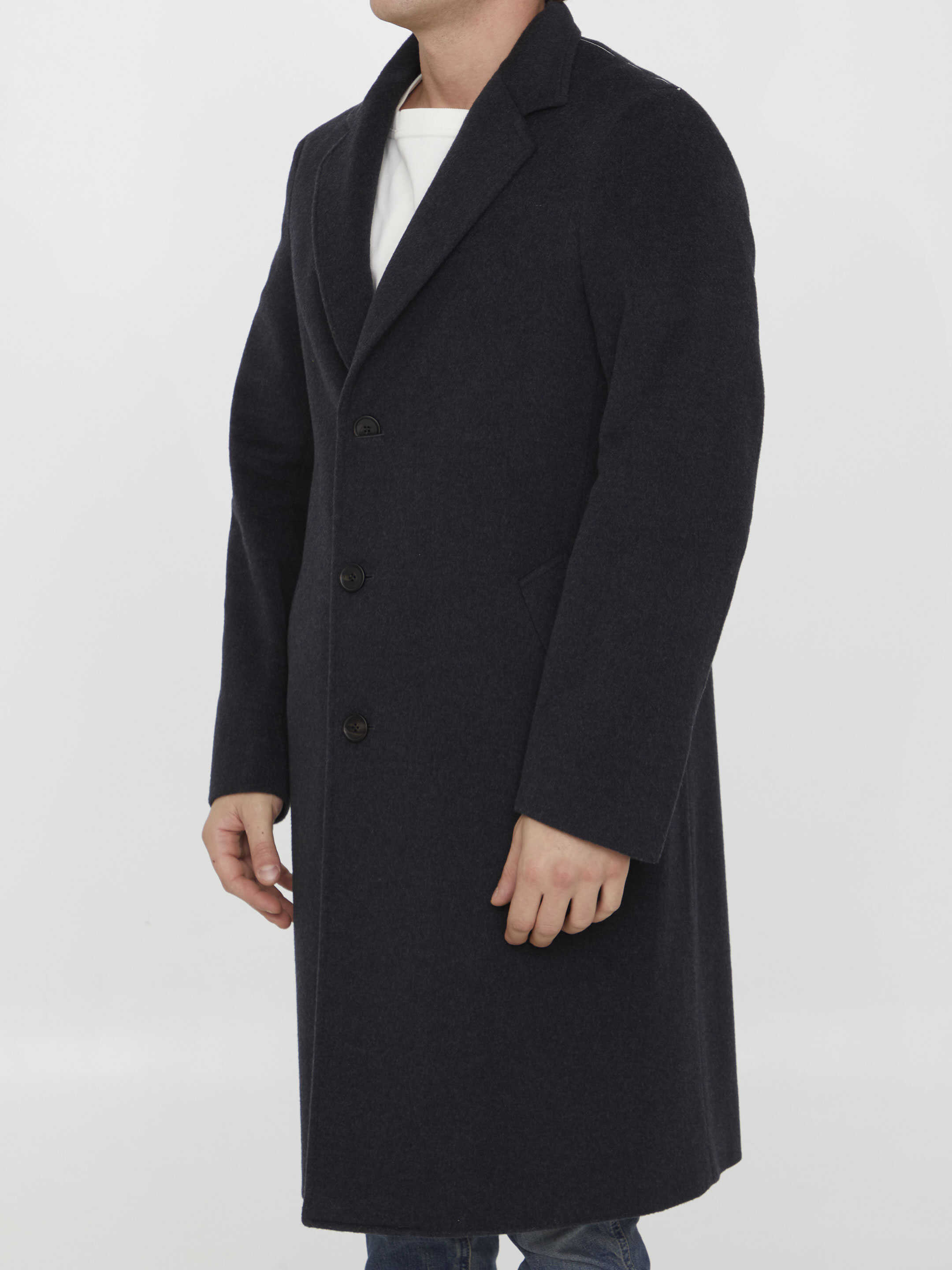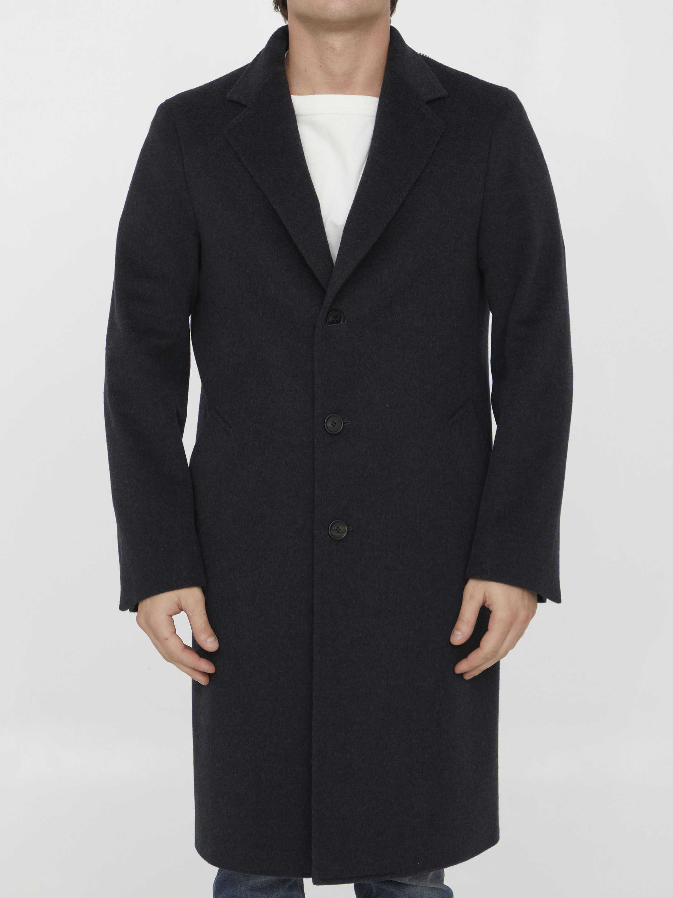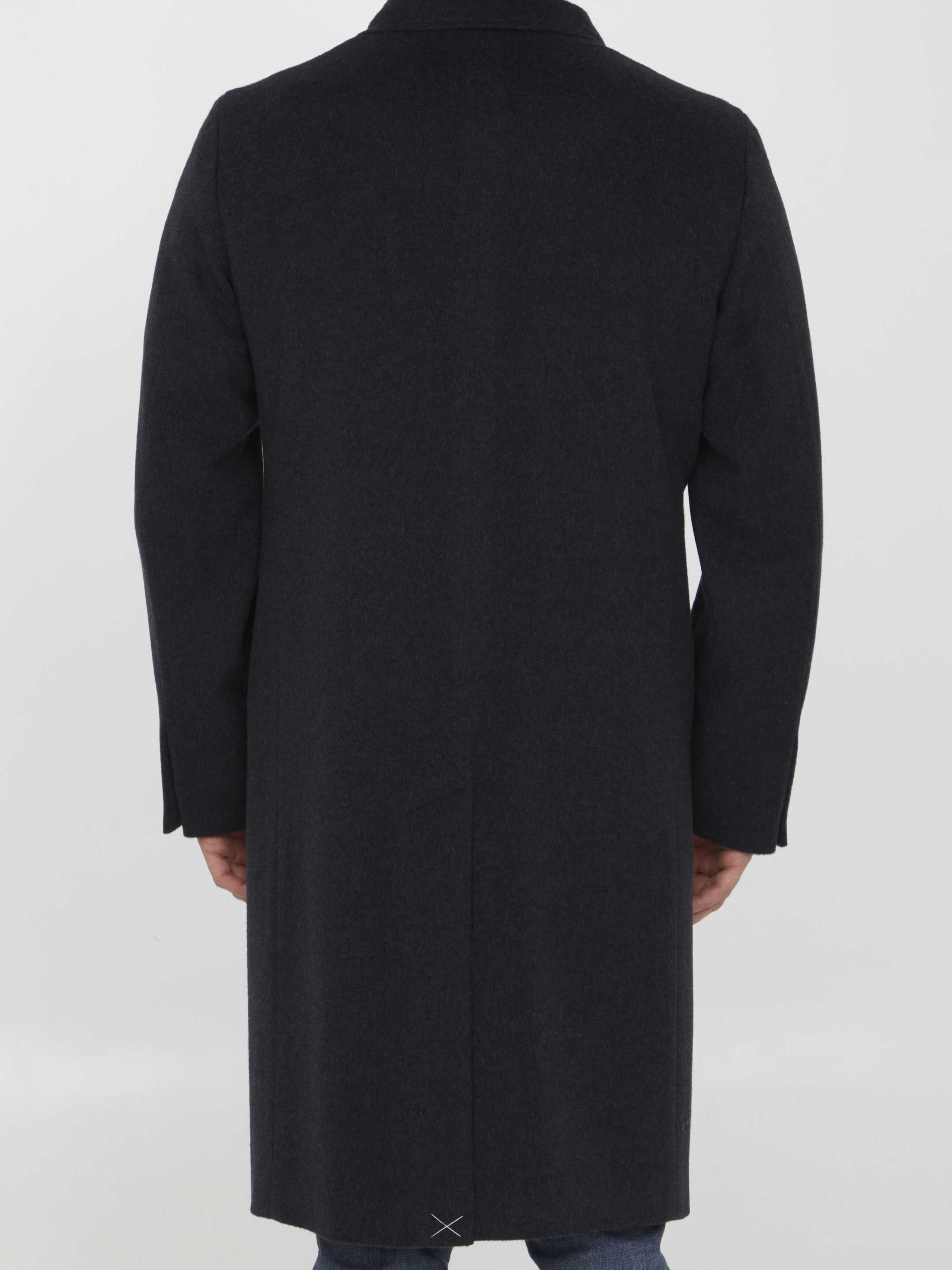 Single-breasted coat in grey wool and cashmere. It features peaked lapels, front three-button closure and two side welt pockets. Regular fit.
