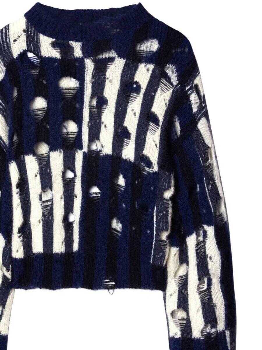 Black and white mohair and wool blend Shibori sweater from Off-White featuring long sleeves, distressed effect, stripe inserts and round neck. Size Type: Woman IT