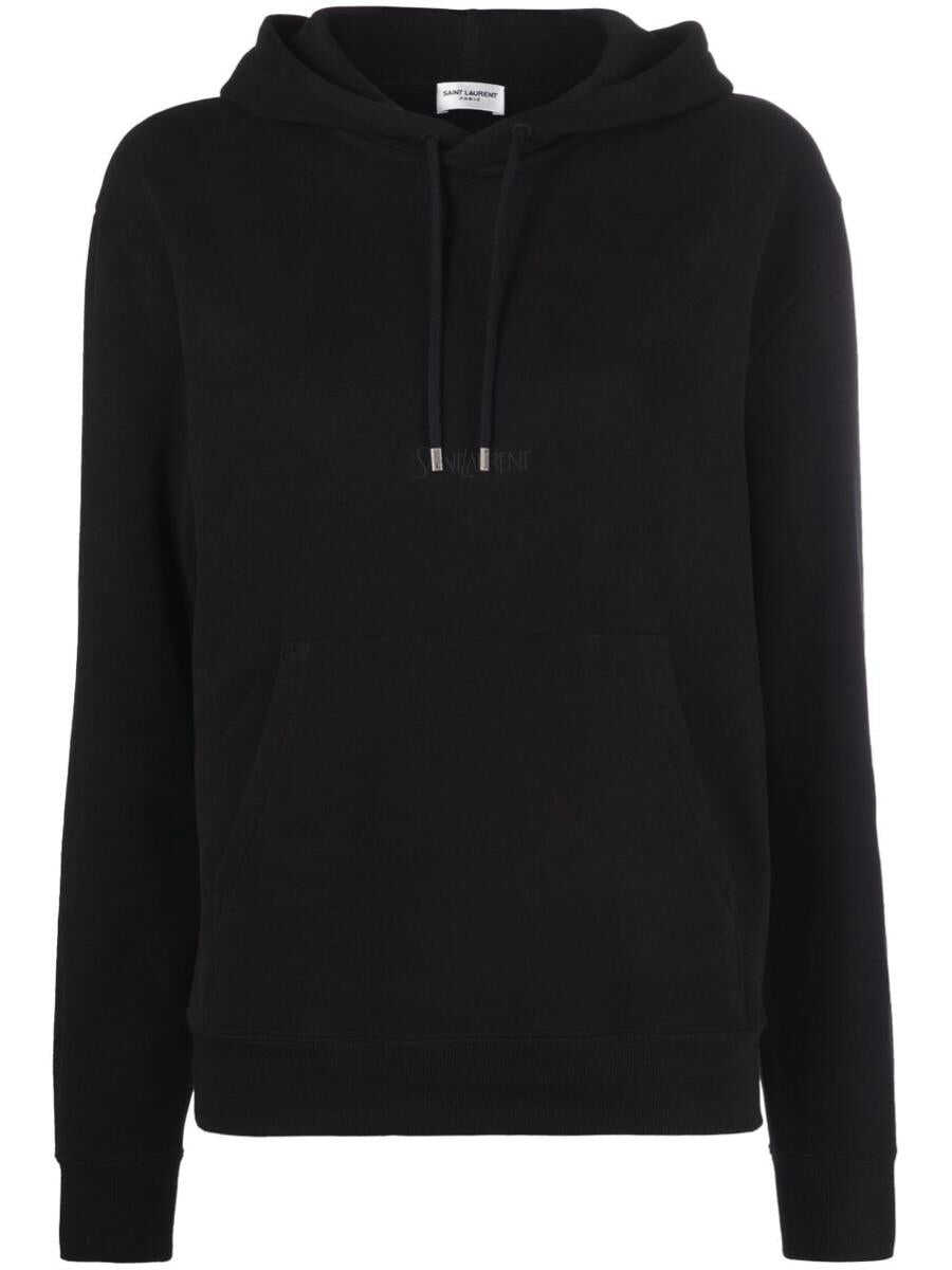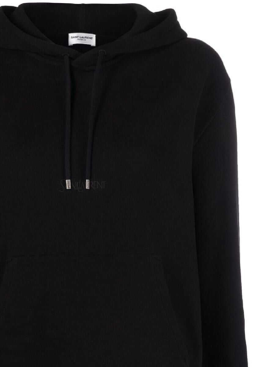 logo-print drawstring hoodie from SAINT LAURENT featuring black, cotton, logo print to the front, drawstring hood, front pouch pocket, long sleeves, ribbed cuffs and hem and straight hem. SLEEVE LENGTH: 47.0 Centimetres Shoulder: 48.0 Centimetres LENGTH: 63.0 Centimetres WAIST: 94.0 Centimetres BUST: 106.0 Centimetres