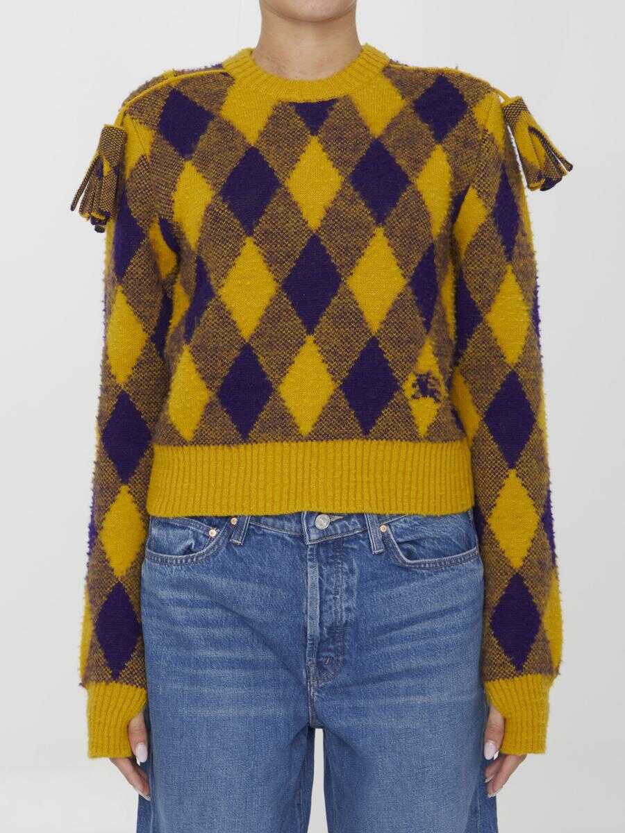 Long-sleeved crewneck pullover in yellow and purple jacquard Argyle brushed wool. It features tassels at shoulders, Equestrian Knight Design embroidery on the front, cuffs with thumbholes and ribbed trims. Slim fit.