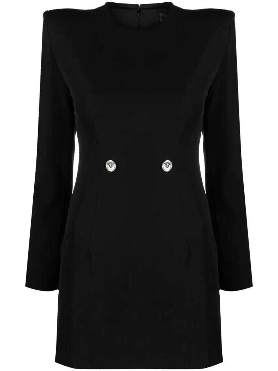 Versace's minidress crafted in black wool grain de poudre with Medusa buttons. Featuring crew neck, back hook-and-eye / invisible zip closure, long sleeves with padded shoulders and buttoned cuffs, front decorative buttons and straight hem. Lined interior.